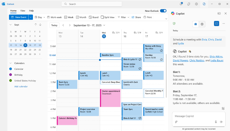In Outlook, scheduling meetings becomes more intuitive with natural language capabilities now available in (Microsoft 365) Copilot Chat. Users can propose, refine and finalize meeting details conversationally without navigating complex forms. For those using classic Outlook for Windows, a new sidebar experience brings Copilot Chat into the reading and writing pane, enabling real-time assistance in context. Additionally, Copilot can now summarize PDF, Word and PowerPoint attachments directly from emails, streamlining information access without leaving the inbox.