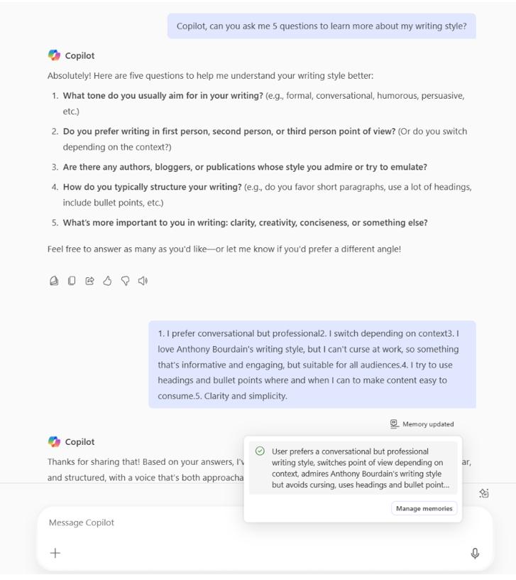 One of the most impactful updates rolling out in July is the introduction of Copilot Memory, a new capability that allows Copilot to remember key details about users to deliver more personalized and efficient support. By capturing meaningful context from conversations, such as preferred tools (“e.g., “I prefer Python for data science”) or communication styles, Copilot can tailor its responses to better align with individual working habits. Users can also set Custom Instructions to define tone, formatting or other preferences that will be applied consistently across interactions. To help Copilot learn faster, users can prompt it with questions like “Ask me 5 questions to learn more about my writing style.” Importantly, memory is fully transparent and user-controlled: individuals can view, edit or delete stored memories at any time, and memory can be turned off entirely. A subtle “memory updated” notification ensures users are always informed. Copilot Memory is enabled by default, with tenant-level controls available for IT administrators to manage deployment across the organization.